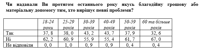 Отмечается, что уровень вовлеченности в благотворительную деятельность пока остается выше, чем до Евромайдана. В частности, в течение 2018 большую благотворительную помощь оказывали жители запада (58%) и центра (41%) и меньше - юга (23%) и востока (24%). Опрос проводился с 19 по 25 декабря 2018 во всех регионах Украины за исключением Крыма и оккупированных территорий Донецкой и Луганской областей. Для исследования были опрошены 2017 респондентов в возрасте от 18 лет. Теоретическая погрешность выборки не превышает 2,3%.