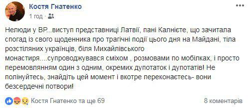 Известный поэт, композитор и телеведущий Константин Гнатенко возмутился обстановкой в Раде во время выступления евродепутата Сандры Калниете. Она говорила о событиях 19 февраля 2014 на Евромайдане. В это время часть парламентариев были заняты своими телефонами. Также он сообщил, что часть народных депутатов разговаривали друг с другом.