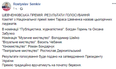"В номинации "Публицистика, журналистика": Богдан Горынь и Оксана Забужко. Номинация "Музыкальное искусство": Владимир Шейко, "Визуальное искусство": Василий Чебаник, "Киноискусство": Роман Бондарчук, "Театральное искусство": Ростислав Держипильский", - написал в соцсети Семкив и добавил, что результаты голосования будут представлены на утверждение Президенту Украины.