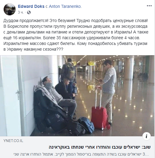 Во вторник, 19 февраля, около 35 израильтян, прибывших в Киев утренним рейсом компании "Эль-Аль"  не прошли  паспортный контроль в аэропорту Борисполь. Об этом говорится на Фейсбук-странице пользователя Edward Doks.
