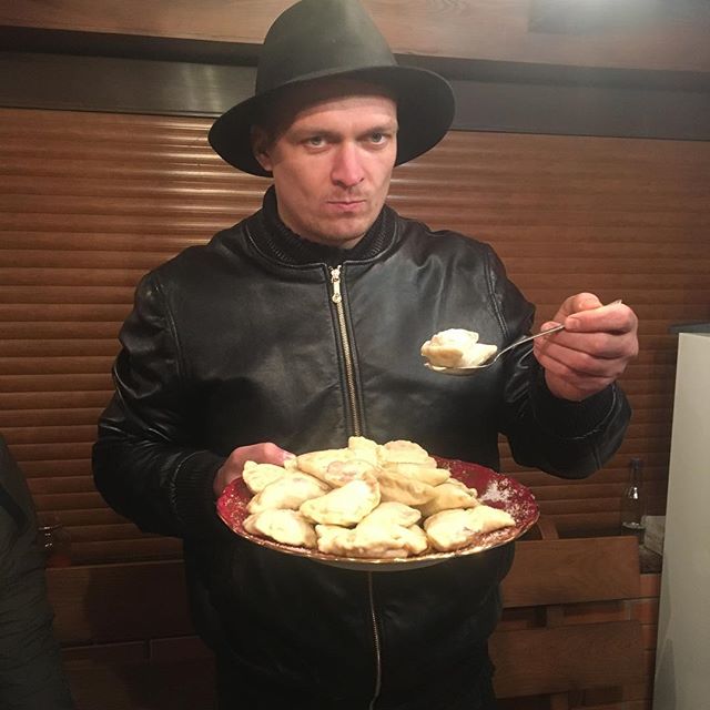 Появилось фото, как украинский боксер Усик в кожаной куртке и шляпе съел полную тарелку вареников