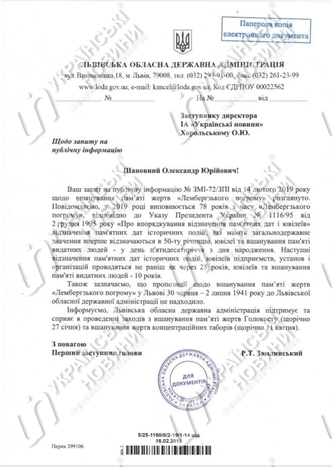 В ответ на журналистский запрос во Львовской ОГА отметили, что "предложения о чествовании памяти жертв "Лембергского погрома" во Львове 30 июня - 2 июля 1941 года во Львовскую областную государственную администрацию не поступали". При этом в администрации уточнили, что согласно указу Президента Украины №1116/95, памятные даты исторических событий отмечаются впервые в 50-ю годовщину, а следующие – не ранее, чем через 25 лет после предыдущего. Со дня "Лембергского погрома" в этом году исполняется 78 лет.