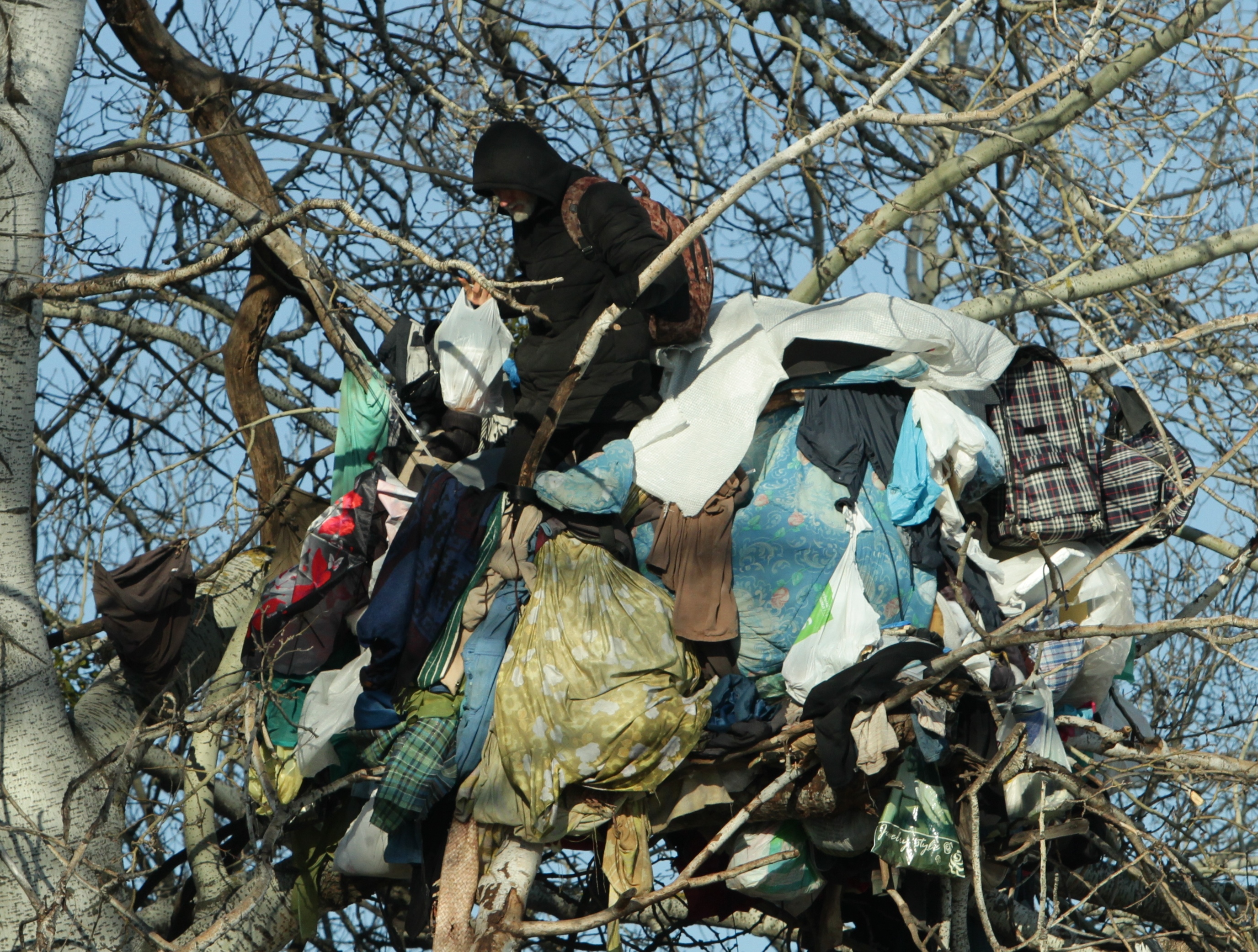 Оказалось, на дереве он живет с 2016 года. Шалаш Владимира находится на высоте трехэтажного дома. Взобраться к жилищу можно только по высокому стволу. К слову, он прогрызен бобрами. Домик утеплен разной ветошью - старыми одеялами, шторами, одеждой. От осадков защищает большой зонт.