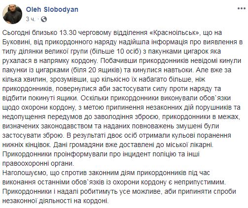 Пограничники отдела "Красноильск", патрулировавшие участок украинско-румынской границы, применили оружие, чтобы остановить нападение контрабандистов, в результате были ранены два человека. Об этом сообщил на своей странице в Facebook пресс-секретарь Госпогранслужбы Олег Слободян.