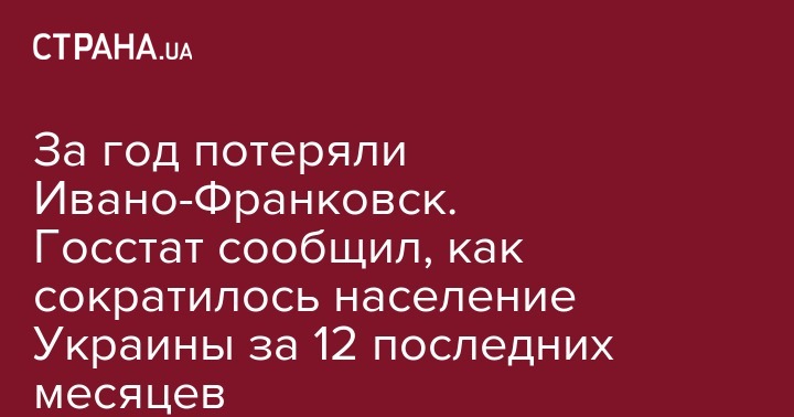 Согласно данным Госстата, за 12 месяцев Украина потеряла 233,2 тысячи человек, что составляет практически население такого областного города, как Ивано-Франковск, где по данным на начало 2018 года проживают чуть больше 235 тысяч человек.