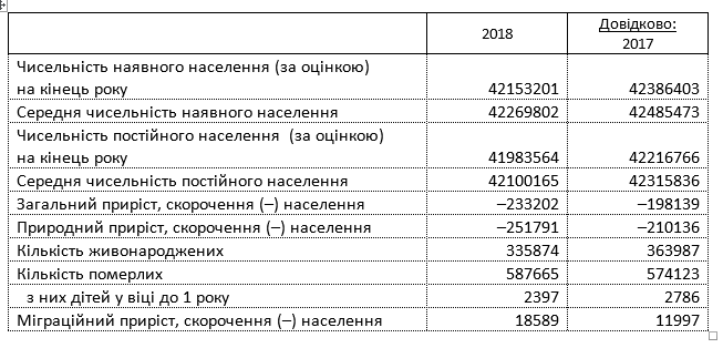 За 12 последних месяцев население Украины сократилось больше, чем на 200 тысяч человек и по оценке на январь 2019 года составляет чуть более 42 миллионов 153 тысяч человек.