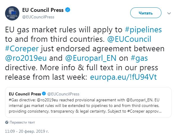 "Правила газового рынка ЕС будут применяться к трубопроводам из третьих стран. Coreper одобрил соглашение между председательствующей в ЕС Румынией и Европарламентом по газовой директиве", - говорится в сообщении.