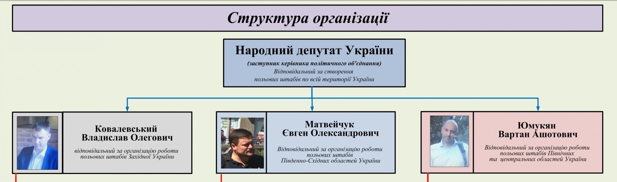 За организацию штабов в северных и центральных регионах отвечал Вартан Юмукян (глава партии "Единая Украина", экс-советник главы Луганской областной администрации Валерия Голенко), в западных - Владислав Ковалевский и в восточных - Евгений Матвейчук.