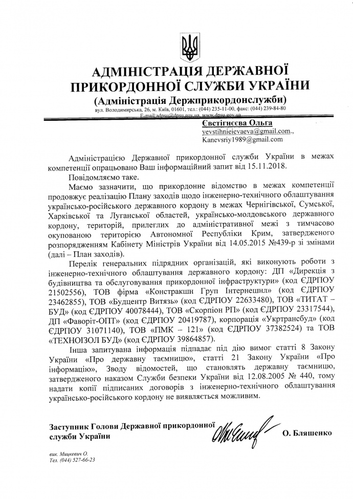 В ноябре 2018 года, по данным Госпогранслужбы, 9 компаний строили "Стену": кроме упомянутого ООО "Стройцентр Витязь", это ГП "Дирекция по строительству и обслуживанию пограничной инфраструктуры", ООО "ТИТАН-СТРОЙ", ООО "Скорпион РП", корпорация "Укртрансбуд", ООО "ПМК-121", ООО "Техноизол БУД", ООО Фирма "Констракшн Груп Интернэшнл", которая находится в официальном "черном списке" Антимонопольного комитета из-за нарушений на тендерах, и ГП "Фаворит-ОПТ", которое принадлежит семье народного депутата Борислава Розенблата.
