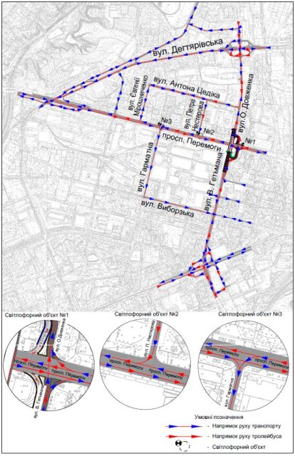 по ул. Вадима Гетьмана - ул. Александра Довженко (сторону ул. Телиги) будет сохранен существующий выезд на проспект Победы с возможностью прямого пересечения проспекта с выездом на ул. Александра Довженко (на этом участке также будет установлен временный светофор);
