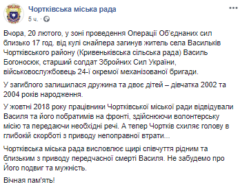 Украинский боец из Тернопольской области Василий Богоносюк погиб от пули снайпера на Донбассе в среду, 20 февраля. Об этом сообщается на странице Чортковского горсовета в соцсети Facebook.
