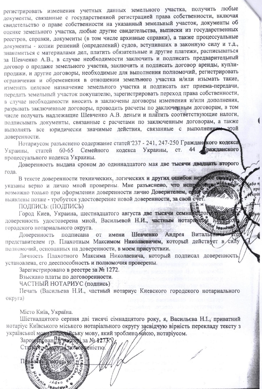 Но он лгал. Ниже я публикую доверенность, которой Посол Шевченко прямо уполномочил своего помощника продать именно эту землю. Посол заверил её подальше от посторонних глаз у своего подчиненного - консула Украины в Канаде Костенко.