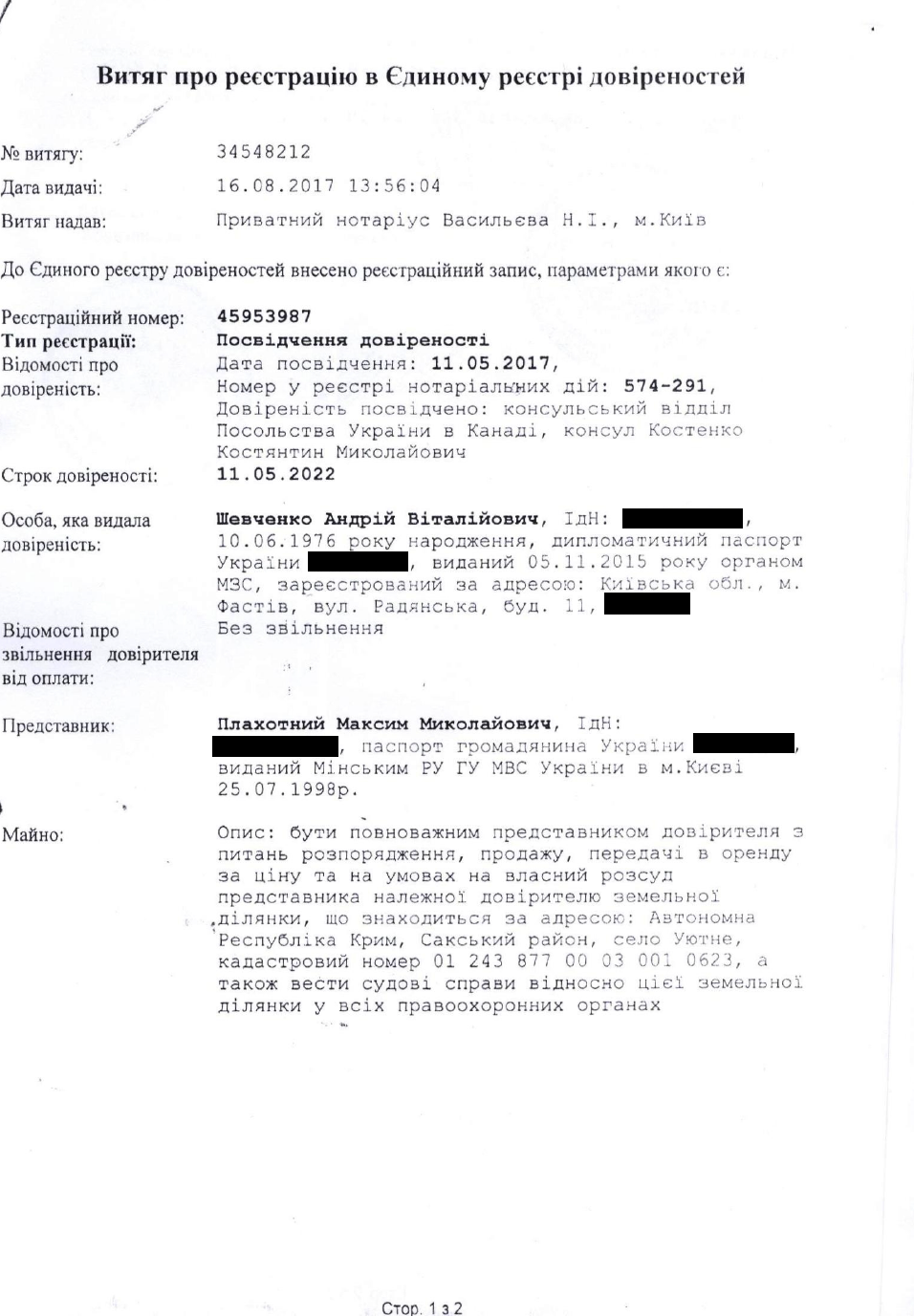 !Совокупность этих факторов и опубликованные документы доказывают, что подписывая доверенность именно на этот участок земли и уполномочивая на такую сделку своего персонального помощника в 2017 году, через три года после аннексии, Посол Шевченко действовал умышленно, организованной группой и из корыстных побуждений, точно зная, что в оккупированном Крыму такие сделки проводят российские нотариусы, по российским законам, в российских кадастрах и с платежами в российский бюджет", - считает Портнов.
