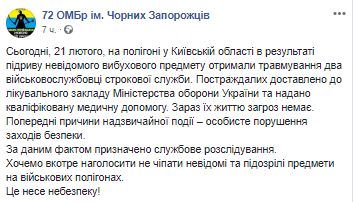 "21 февраля на полигоне в Киевской области в результате подрыва неизвестного взрывного предмета получили травмы двое военнослужащих срочной службы. Пострадавшие доставлены в лечебное учреждение Министерства обороны Украины, им оказана квалифицированная медицинская помощь. Сейчас их жизни угроз нет", - говорится в сообщении.