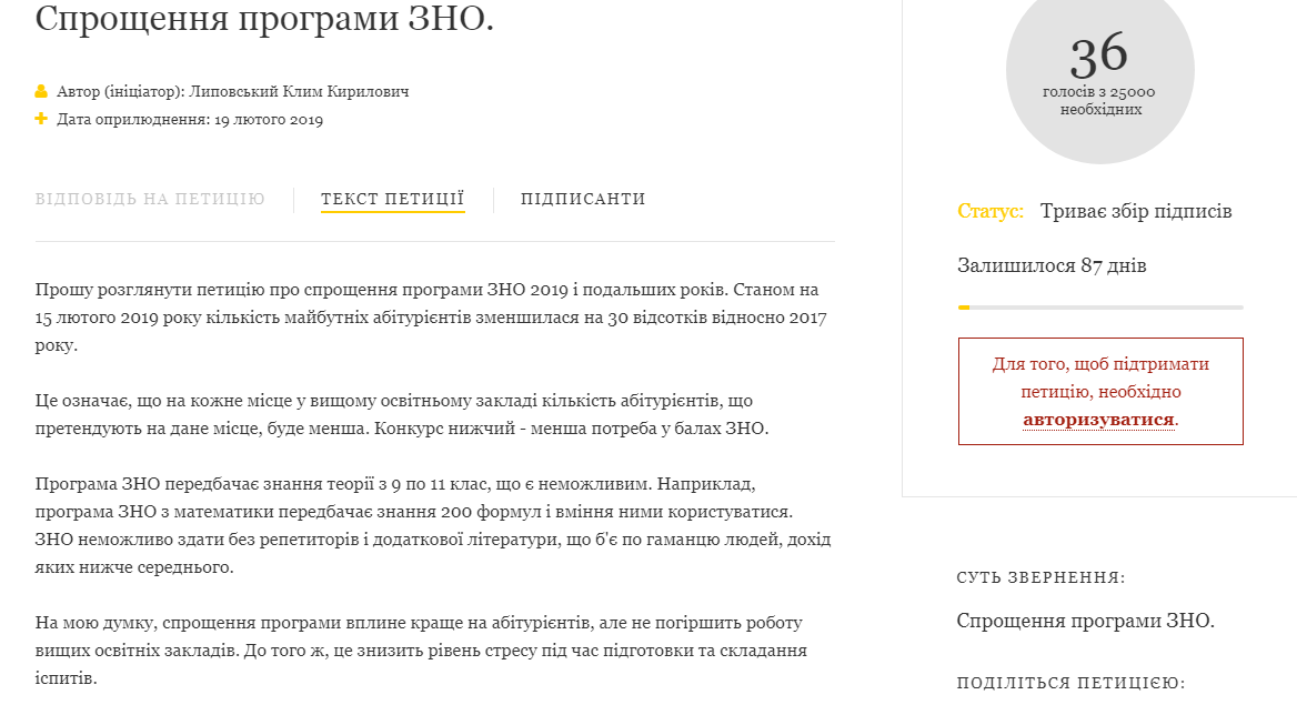 "Прошу рассмотреть петицию об упрощении программы ВНО 2019 и последующих лет. По состоянию на 15 февраля 2019 количество будущих абитуриентов уменьшилось на 30 процентов относительно 2017 года", - отметил автор петиции Клим Липовский.