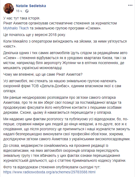 Украинского олигарха Рината Ахметова обвинил в организации систематической слежки за журналистом Михаилом Ткачом и всей съемочной группой программы "Схемы". Об этом в социальной сети Facebook сообщила автор и ведущая передачи Наталья Седлецкая в четверг, 21 февраля.