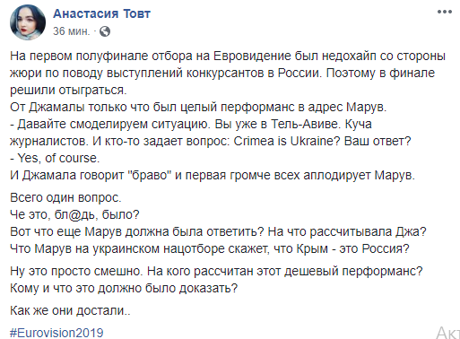 "Мне по-человечески очень жаль дуэт Анна-Мария Опанасюк (Anna-Maria Opanasyuk), которых загнобили за то, что их родители работают в оккупированном Крыму. И за то, что они в одном интервью четко не назвали Крым - Украиной.