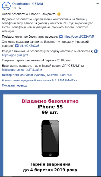 99 новых телефонов китайского производства iPhone 5S общей стоимостью свыше 150 тысяч гривен (копии) можно забрать бесплатно до 4 марта 2019 года. Сообщение об этом опубликовано на страничке СЕТАМ в социальной сети Facebook.