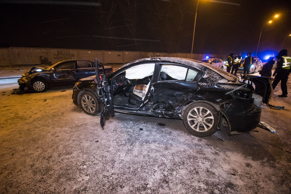 По словам водителя Volkswagen, он двигался по Здолбуновской в сторону Днепровской набережной, а Mazda ехала в противоположном направлении. Во время движения Mazda врезалась в Toyota и после этого отлетела в Volkswagen.