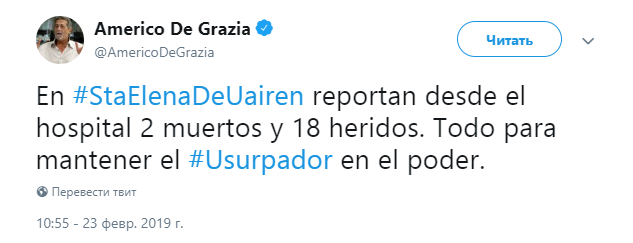 В субботу, 23 февраля, два человека погибли в столкновениях с подразделениями Национальной гвардии на границе Венесуэлы и Бразилии. Об этом в Twitter сообщил депутат контролируемой оппозицией Национальной ассамблеи (однопалатного парламента) страны Америко де Грациа.