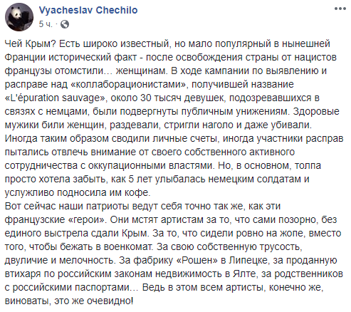 Вот сейчас наши патриоты ведут себя точно так же, как эти французские "герои". Они мстят артистам за то, что сами позорно, без единого выстрела сдали Крым. За то, что сидели ровно на жопе, вместо того, чтобы бежать в военкомат. За свою собственную трусость, двуличие и мелочность. За фабрику "Рошен" в Липецке, за проданную втихаря по российским законам недвижимость в Ялте, за родственников с российскими паспортами… Ведь в этом всем артисты, конечно же, виноваты, это же очевидно!".