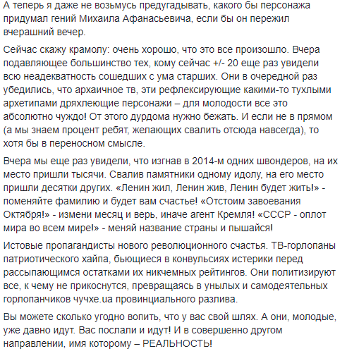 "Вчера подавляющее большинство тех, кому сейчас +/- 20 еще раз увидели всю неадекватность сошедших с ума старших. Они в очередной раз убедились, что архаичное тв, эти рефлексирующие какими-то тухлыми архетипами дряхлеющие персонажи – для молодости все это абсолютно чуждо! От этого дурдома нужно бежать. И если не в прямом (а мы знаем процент ребят, желающих свалить отсюда навсегда), то хотя бы в переносном смысле.
