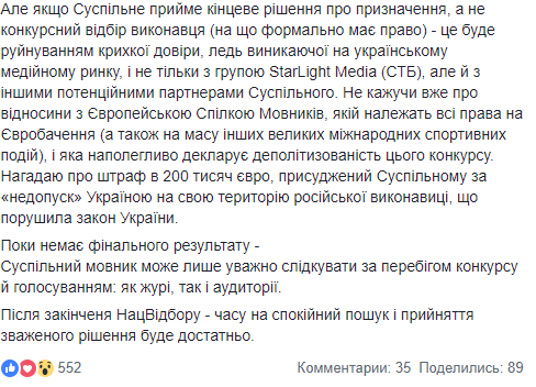 "Выходов несколько, но немного других. Уравновесить контракт пунктами о возмещении в бюджет Украины всех сум налогов, уплаченных президентом Порошенко с прибыли российской Липецкой фабрики в российский бюджет за время конфликта. Или дать второй шанс музыкальному коллективу «Гринджолы» с новой версией трека «Разом нас багато». Уверен, в 2005 на Евровидении их недооценили", пишет адвокат Андрей Смирнов.