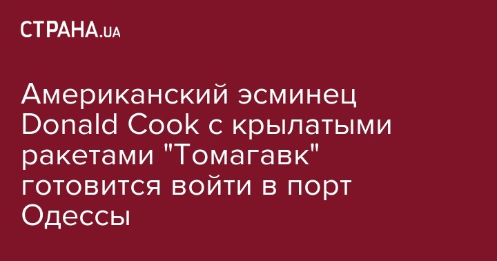 Ракетный эсминец ВМС США "Дональд Кук", который вошел в акваторию Черного моря еще 19 февраля, в настоящее время подходит к Одессе, и сегодня, 25 февраля пришвартуется в ее порту.