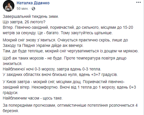 Во вторник, 26 февраля, Украину настигнет порывистый ветер, достигающий 15-20 метров в секунду и может появиться мокрый снег. Об этом сообщает синоптик Наталья Диденко на своей странице в Facebook.