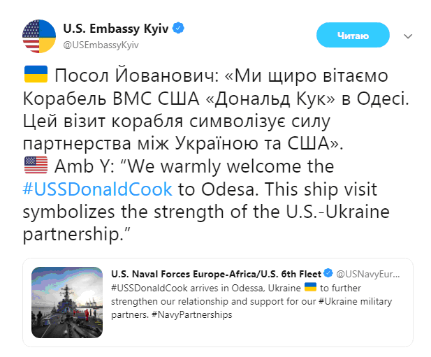 В посольстве США в Украине поприветствовали прибытие корабля в Украину и заявили, что визит символизирует силу партнерства между Украиной и США.