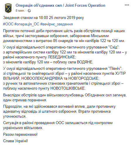 В течении сегодняшних суток, 25 февраля, в районе проведения Операции объединенных сил на Донбассе в результате обстрелов со стороны противника погиб украинский военнослужащий. Об этом говорится в вечерней сводке штаба ООС, опубликованной в Facebook.