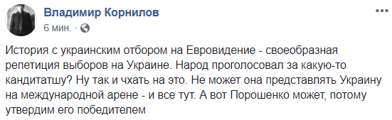 "История с украинским отбором на Евровидение - своеобразная репетиция выборов на Украине. Народ проголосовал за какую-то кандитатшу? Ну так и чхать на это. Не может она представлять Украину на международной арене - и все тут. А вот Порошенко может, потому утвердим его победителем", - пишет политолог Владимир Корнилов.