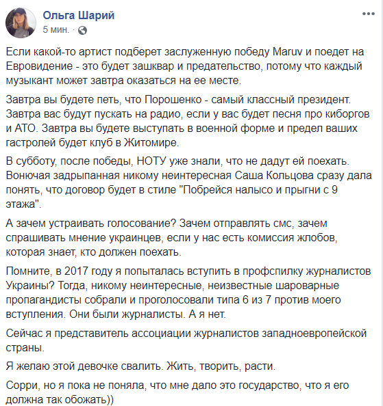 Журналистка Ольга Шарий говорит о том, что для любого артиста поехать на Евровидение вместо Maruv - это позор:
