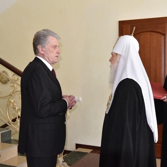"25 февраля 2019 Святейший Патриарх Филарет поздравил Президента Украины (2005-2010) Виктора Ющенко с 65-летием со дня рождения. Вместе с Патриархом Виктора Ющенко поздравил архиепископ Вышгородский Агапит.
