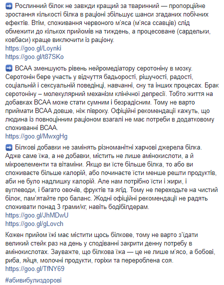 Каждый прием пищи должен содержать что-то белковое, поэтому не стоит съедать большой стейк раз в день в надежде закрыть дневную потребность в аминокислотах. Белковая пища - это не только мясо, а бобовые, рыба, яйца, молочные продукты, орехи и переработанная соя. Что касается белковых добавок, они не могут полностью удовлетворить потребность организма в белках, также их не стоит принимать дольше полугода. Стоит помнить, что переизбыток белка может привести к негативным последствиям, поэтому Супрун рекомендует составлять рацион с учетом ее советов.