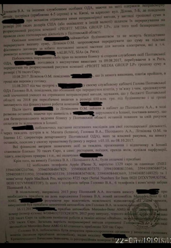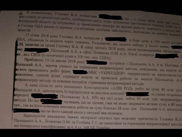 По данным следствия, в августе 2017 года представитель консорциумов "АЛВИ РОД" и "Укрбуддор" на бизнес-форуме в Полтаве познакомился с Головко и Песоцким, после чего руководители ОГА взяли у предпринимателя 200 000 долларов взятки за непрепятствование ведению бизнеса на Полтавщине.