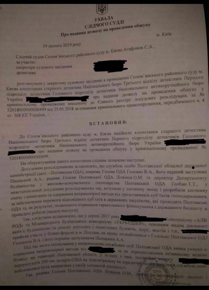 Об многомиллионных откатах говорится в постановлении Соломенского райсуда Киева. Следователи НАБУ установили, что председатель ОГА Валерий Головко, его первый заместитель Андрей Песоцкий, советник губернатора Литвинов А.Н. и директор департамента строительства и ЖКХ Полтавской ОГА Голбан Т.Т. создали преступную схему по вымогательству взяток от предпринимателей за обеспечение их победы в госзакупках, проводимых обладминистрацией.