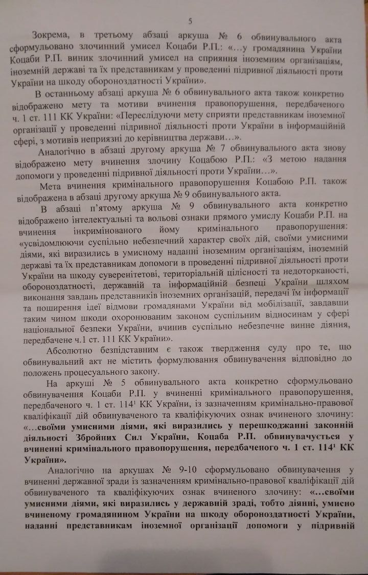 "Утверждение суда первой инстанции об отсутствии в обвинительном акте умысла, мотивов, уголовного нарушения, противоречит непосредственно содержанию обвинительного акта. В частности в обвинительном акте сформулирован преступный умысел Р.П.Коцабы:"...у гражданина Украины Р.П.Коцабы возник преступный умысел по содействованию иностранным организациям, иностранной стране и их представителям в проведении подрывной деятельности против Украины в ущерб обороноспособности Украины" - из текста апелляционной жалобы