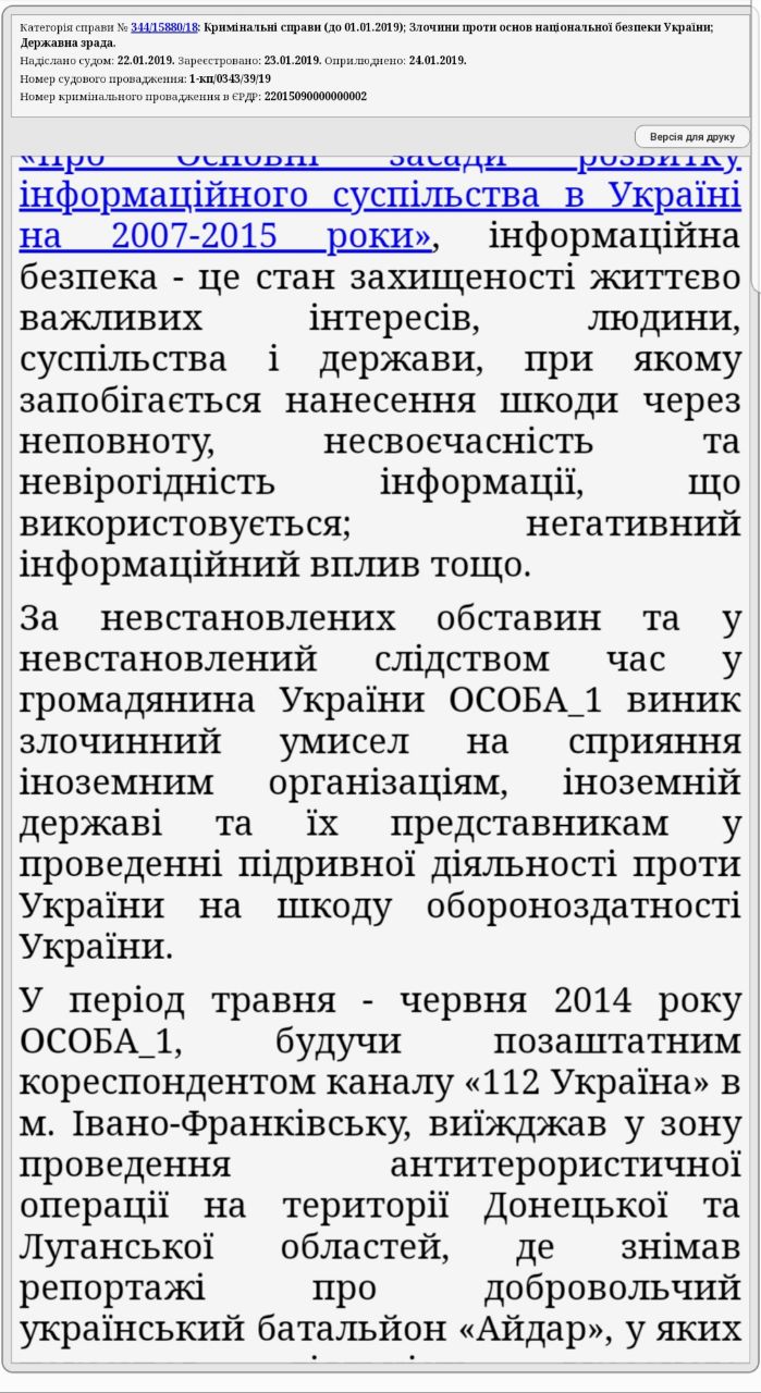 "При неустановленных обстоятельствах и в неустановленное следствием время у гражданина возник преступный умысел в содействии иностранным организациям, иностранной стране и их представителям в проведении подрывной деятельности против Украины....", - говорится в тексте уголовного дела.