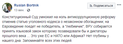 "Конституционный Суд умножил на ноль антикоррупционную реформу отменив статью уголовного кодекса о незаконном обогащении; на Евровидение поедет не победитель, а "любимчик"; ВРУ собирается принять языковой закон которому позавидовали бы и диктаторы прошлого века ... Это уже ЕС и НАТО или Африка? Нет глубины у нашего дна. Запоминайте всех этих людей", заявил политолог Руслан Бортник.