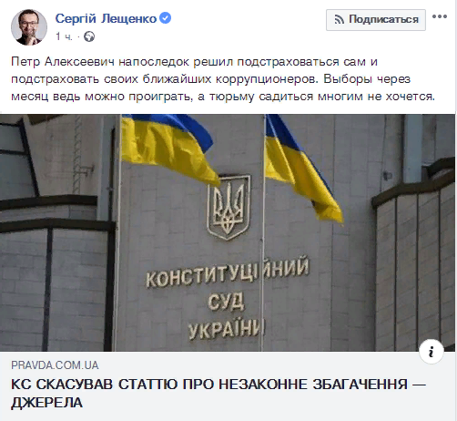 Нардеп Сергей Лещенко пишет у себя в Facebook: "Петр Алексеевич напоследок решил подстраховаться сам и подстраховать своих ближайших коррупционеров. Выборы через месяц ведь можно проиграть, а тюрьму садиться многим не хочется".