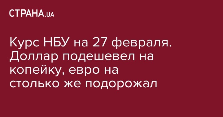 Курс НБУ на 27 февраля. Доллар подешевел на копейку, евро на столько же подорожал