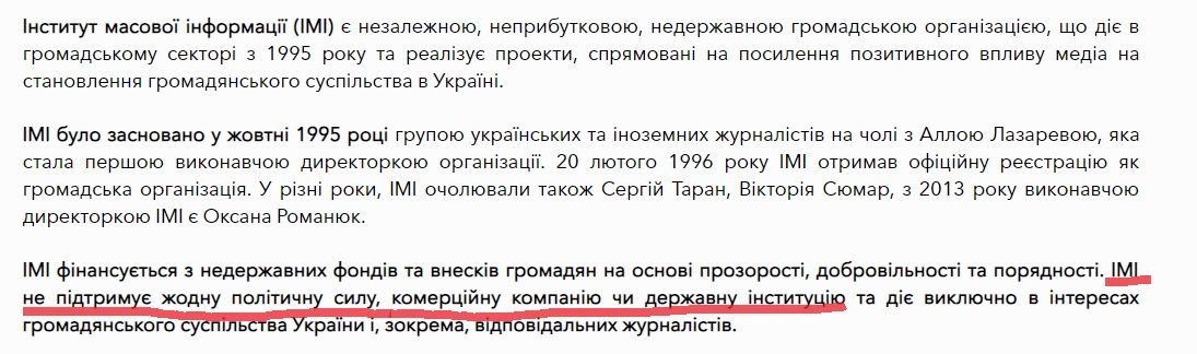Между тем, Институт массовой информации позиционирует себя как независимая и незаангажированная организация, отстаивающая, в том числе, такие ценности, как непредвзятость и незаангажированность средств массовой информации.