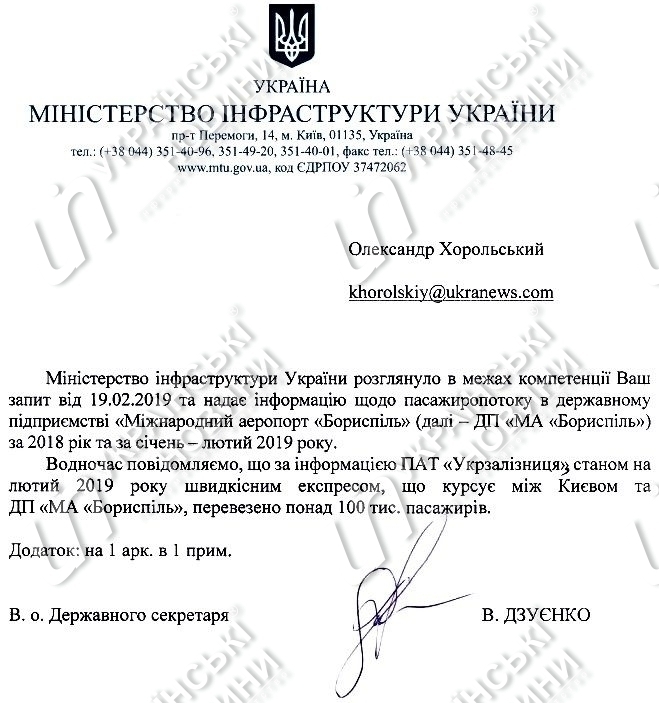 С момента запуска электрички - 30 ноября 2018 года - и по февраль 2019 года ею воспользовались более 100 тысяч человек. Между тем, по данным Мининфраструктуры, пассажиропоток в аэропорту "Борисполь" в этот период составил 2 422 000 пассажиров.