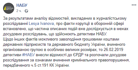 "По результатам анализа сведений, изложенных в журналистском расследовании Леси Ивановой о фактах коррупции в оборонной сфере установлено, что часть описанных событий уже исследуется в рамках досудебных расследований, осуществляемых детективами Национального бюро. Что касается других фактов возможного завладения денежными средствами государственных предприятий и государственного бюджета Украины, совершенного организованной группой в особо крупных размерах 26.02.2019 детективы НАБУ внесли сведения в ЕРДР и начали досудебное расследование по признакам совершения уголовного преступления, предусмотренного ч.5 ст.191 УК Украины", - говорится в сообщении.