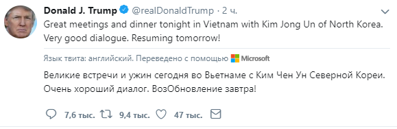 "Великолепные встречи и ужин во Вьетнаме с лидером Северной Кореи Ким Чен Ыном. Очень хороший диалог. С нетерпением жду продолжения наших дискуссий завтра", - написал лидер США Дональд Трамп.