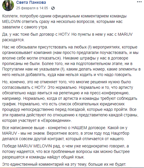 Пиар-менеджмент участника музыкального конкурса Евровидение-2018 от Украины Melovin Светлана Панкова рассказала, что НОТУ год назад предлагала подписать другой контракт по Евровидению, чем тот, который отказалась подписывать певица Maruv. Об этом Панкова написала на своей странице в Facebook.
