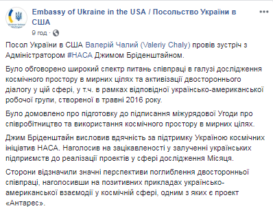 "Посол Украины в США Валерий Чалый провел встречу с руководителем NASA Джимом Бриденштайном.