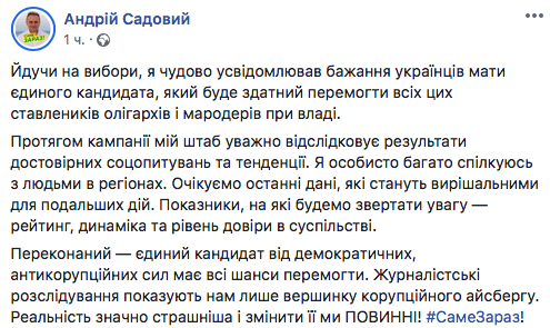 Кандидат в президенты Андрей Садовой впервые намекнул на объединение с другим кандидатом - Анатолием Гриценко. Об этом мэр Львова написал сегодня на своей странице в Facebook.