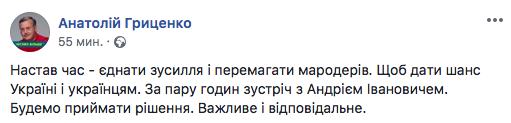 "Пришло время - объединить усилия и побеждать мародеров. Чтобы дать шанс Украине и украинцам. За пару часов встреча с Андреем Ивановичем. Будем принимать решение. Важное и ответственное".